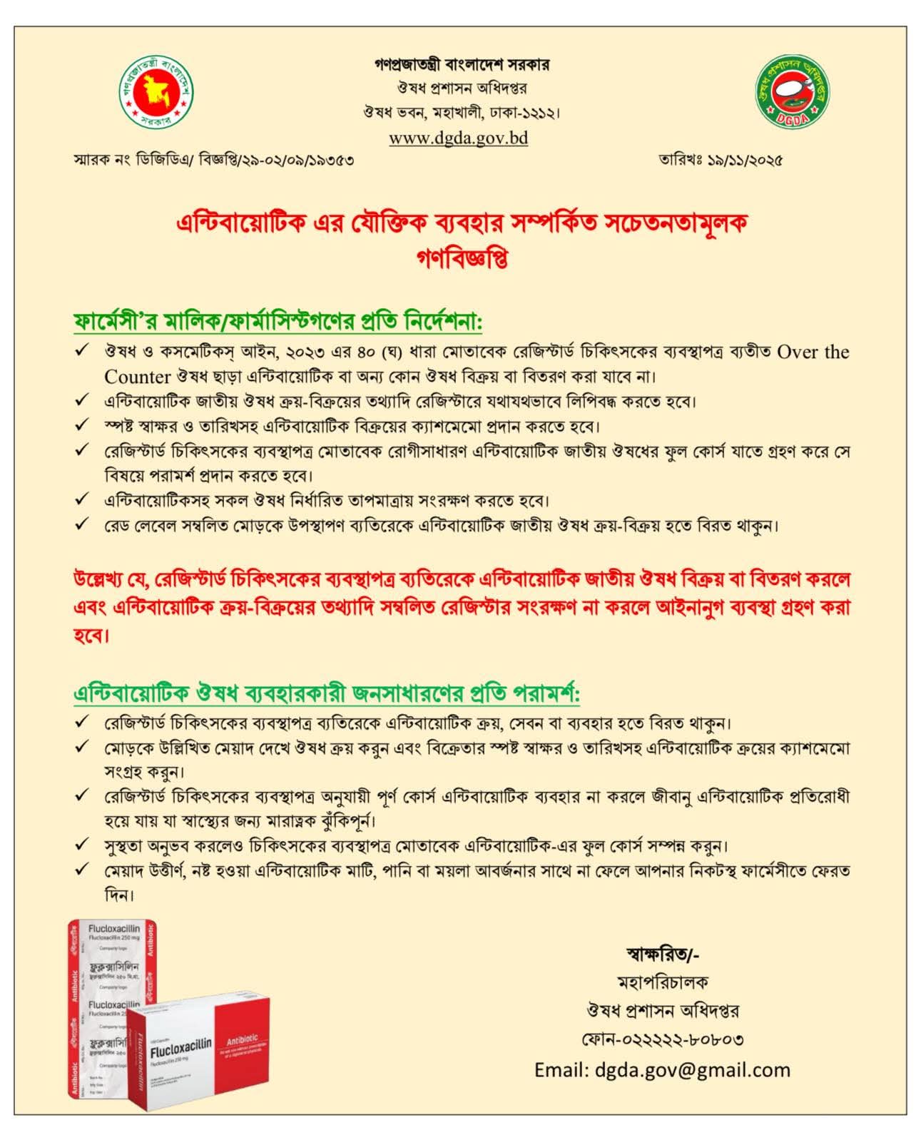 ১. ঔষধ ও কসমেটিকস্ আইন, ২০২৩ এর ৪০ (ঘ) ধারা মোতাবেক রেজিস্টার্ড চিকিৎসকের ব্যবস্থাপত্র ব্যতীত Over the Counter ঔষধ ছাড়া এন্টিবায়োটিক বা অন্য কোন ঔষধ বিক্রয় বা বিতরণ করা যাবে না।