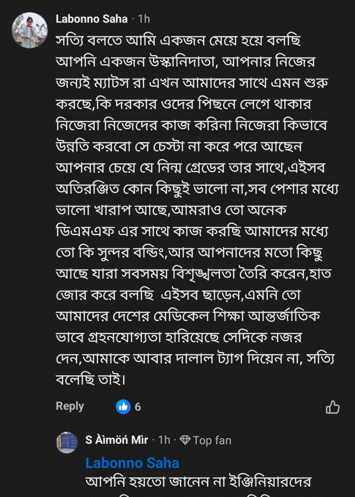 “সত্যি বলতে আমি একজন মেয়ে হয়ে বলছি, আপনি একজন উস্কানিদাতা। আপনার নিজের জন্যই ম্যাটস রা এখন আমাদের সাথে এমন শুরু করছে। কি দরকার ওদের পিছনে লেগে থাকার? নিজেরা নিজেদের কাজ করি না, নিজেরা কিভাবে উন্নতি করবো সেই চেষ্টাটা করি না, বরং পরে আছি আপনার চেয়ে নিম্ন গ্রেডের কারো সাথে তুলনায়। এইসব অতিরঞ্জিত কোন কিছুই ভালো না। সব পেশার মধ্যে ভালো খারাপ আছে। আমরাও তো অনেক ডিএমএফ-এর সাথে কাজ করছি, আমাদের মধ্যে কি সুন্দর বন্ডিং! কিন্তু কিছু লোক আছে যারা সবসময় বিশৃঙ্খলা তৈরি করে। হাত জোর করে বলছি, এইসব ছাড়ুন। এমনি তো আমাদের দেশের মেডিকেল শিক্ষা আন্তর্জাতিকভাবে গ্রহণযোগ্যতা হারিয়েছে — সেদিকে নজর দিন। আমাকে আবার দালাল ট্যাগ দেবেন না, আমি সত্যি কথাই বলেছি।”